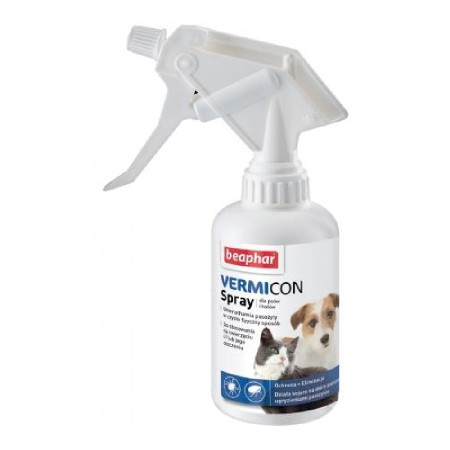 Beaphar Vermicon Spray dla psów i kotów, w tym szczeniąt oraz kociąt powyżej 12. tygodnia życia. Chroni zwierzę przed ektopasożytami, takimi jak pchły, kleszcze, wszy, muchy i komary. Vermicon nie zawiera żadnych chemicznych środków owadobójczych, obezwładnia pasożyty w czysto fizyczny sposób. Można stosować także w otoczeniu zwierzęcia np. na legowisku.