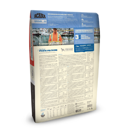 Acana Pacific Pilchard to kanadyjska, biologicznie odpowiednia karma, oparta na jednym źródle białka zwierzęcego. Zawiera 50% północnopacyficznych sardynek w odżywczych proporcjach WholePrey™ (świeże ryby), które odzwierciedlają naturalną dietę, aby dostarczyć wszystkie składniki odżywcze, których potrzebuje pies do prawidłowego rozwoju. Ryby łowione są w naturalnym środowisku wokół wyspy Vancouver, dostarczane świeże i całe. Dodatek warzyw, takich jak świeża dynia i dynia piżmowa są źródłem włókien ułatwiających trawienie.